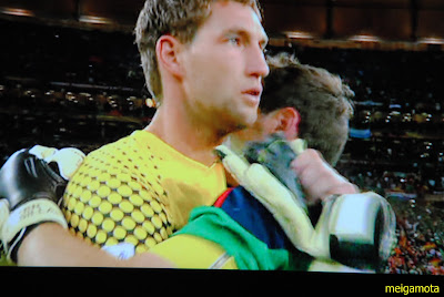 Como segundo comentario y apaciguado mi “contento”, adjunto cuando Iker Casillas se abraza al portero de la Selección de Holanda, éste refleja en su expresión el gesto de la  frialdad de los que se sienten derrotados… Casillas abrazó en ese instante a un bloque de hielo.(foto primera) Claro que después nuestro gran Iker ha sido altamente compensado por el besazo de su guapa e inteligente novia: Sara Carbonero. Mi querido Iker,  todo tiene una recompensa y el beso de Sara es altamente valorado y así se  constata.